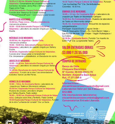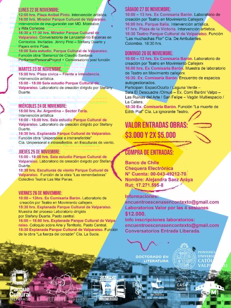 Escenas en Contextos es una instancia que busca consolidarse como una plataforma de difusión, gestión, reflexión, diálogo y acción en torno al vínculo entre Artes Escénicas y Territorios. Se gesta de forma autogestionada e independiente con el apoyo de diversas organizaciones, artistas e instituciones.