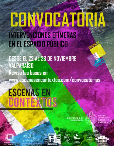 ESCENAS EN CONTEXTOS Encuentro de Prácticas, Metodologías y Poéticas Escénicas en Valparaíso. Acciones y reflexiones sobre la práctica escénica en contextos políticos, comunidades y territorios. ESCENAS EN CONTEXTOS, es un encuentro de Artes Escénicas que tiene como finalidad constituirse en una plataforma de investigación, reflexión, intercambio, producción de saberes y acción en torno al vínculo entre territorio, comunidad y creación escénica.