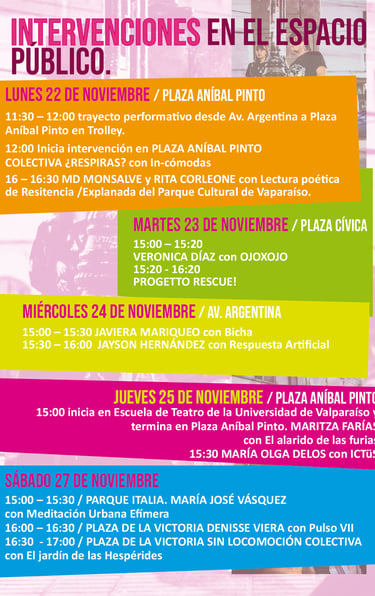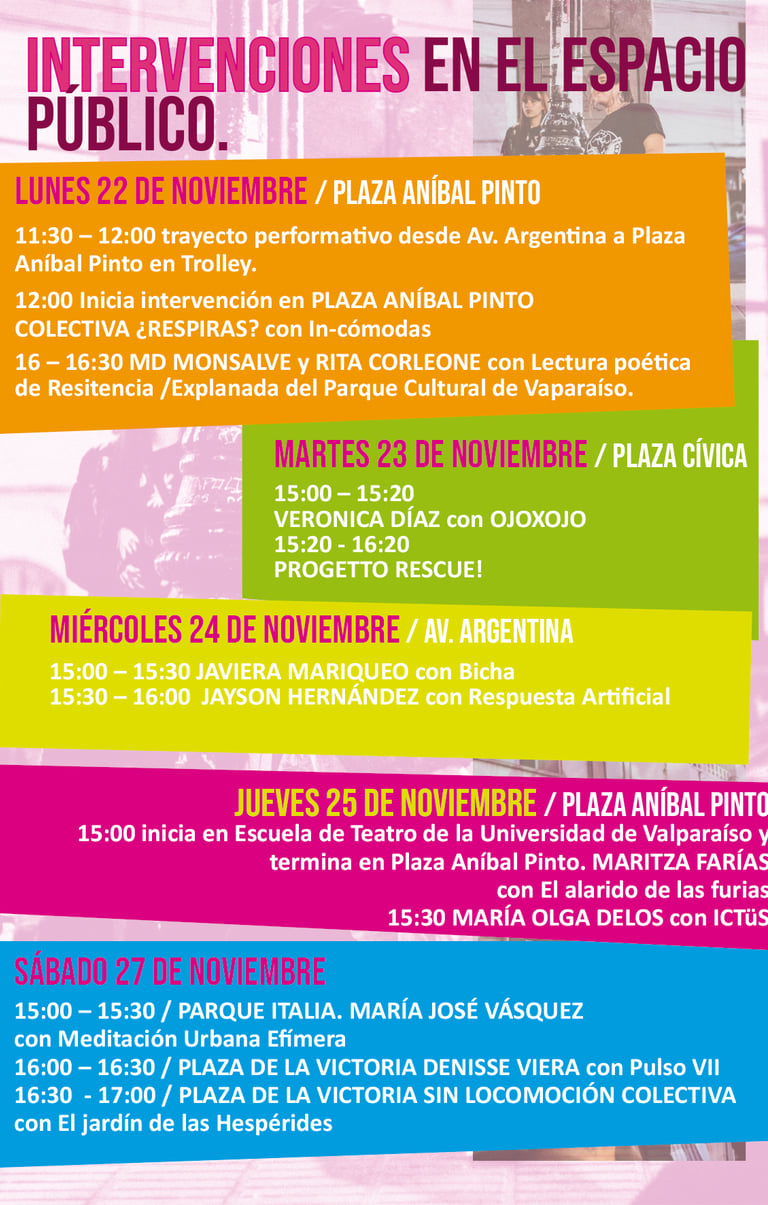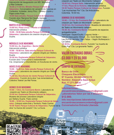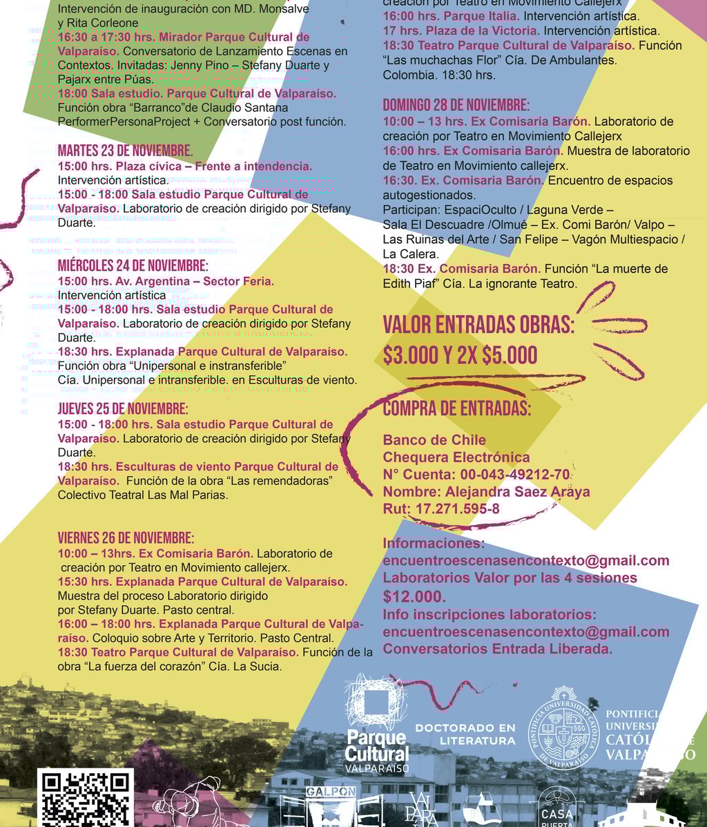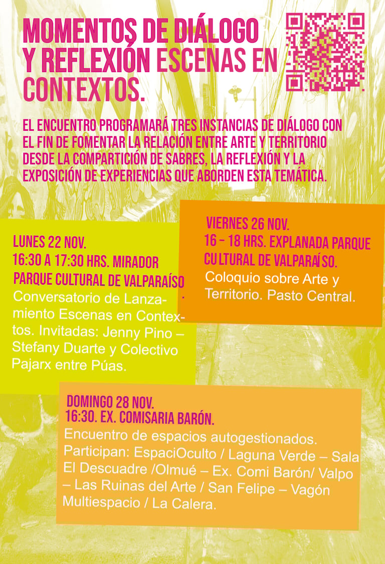 16:30 a 17:30 hrs. Mirador Parque Cultural de Valparaíso. Conversatorio de Lanzamiento Escenas en Contextos. Invitadas: Jenny Pino – Stefany Duarte y Colectivo Pajarx entre Púas.